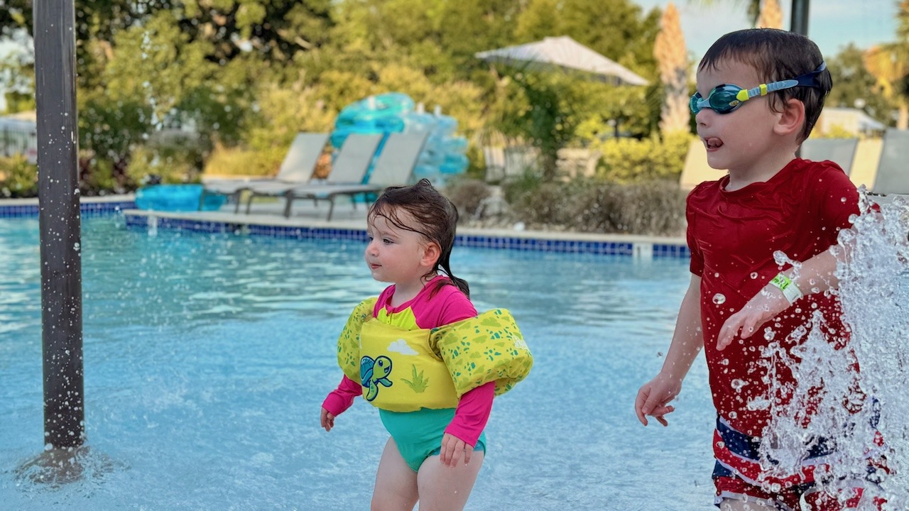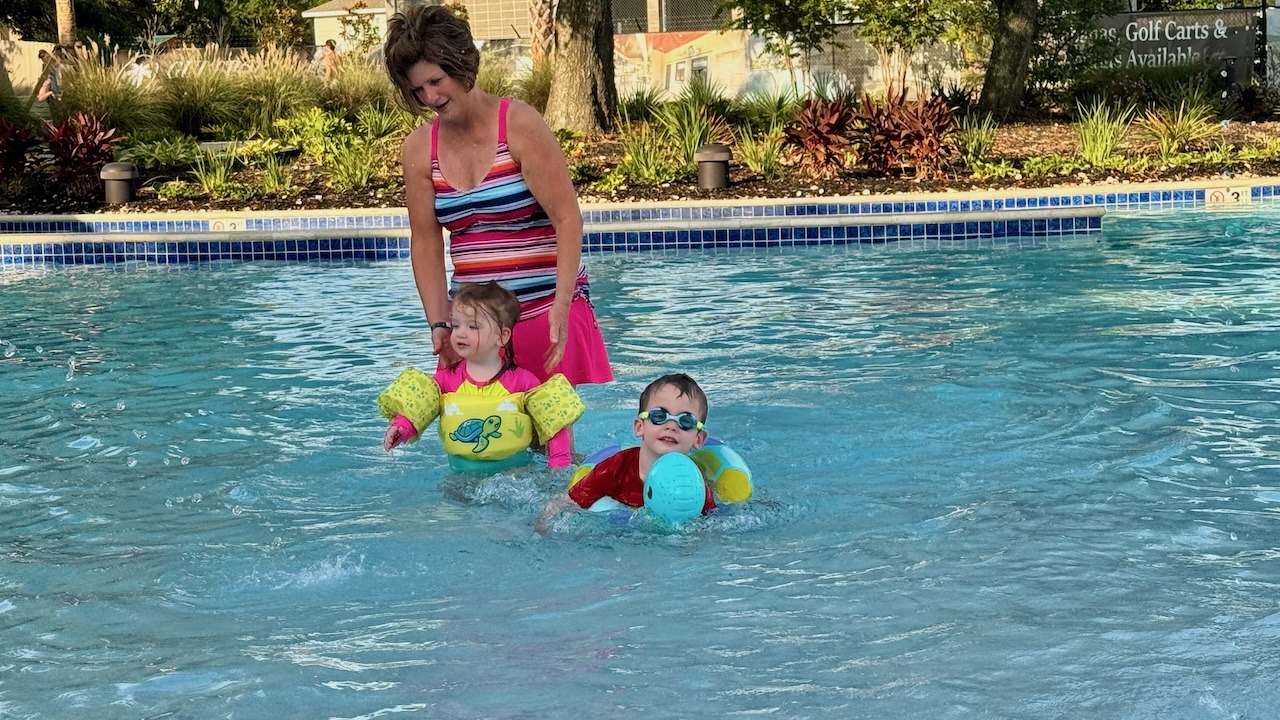 Taylor and family made it in shortly after lunch. The bungalow is nice and has plenty of room for them without using the lofted area. Steps are really tall. We went to the pool and everyone did well. Hayes was not afraid to go under the water and the lazy river was not over his head. So that was fun.